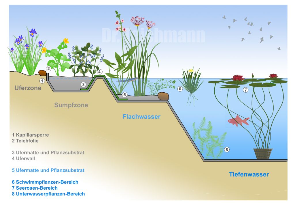 Natürliche stehende Gewässer in der freien Landschaft zeigen in der Regel eine typische Anordnung der Vegetation. Naturfreunde kennen das markante Schilfröhricht, eine Schwimmblattzone mit Seekanne und Glänzendem Laichkraut oder den Bereich der Seerosen, weit vom Ufer entfernt. Jede dieser Vegetationszonen ist an eine gewisse Wassertiefe gebunden. Wassertemperatur, -schichtung, Wellengang, Lichtverhältnisse etc. unterscheiden sich entsprechend und bieten den Teichpflanzen unterschiedliche Umwelt- und Wachstumsbedingungen.