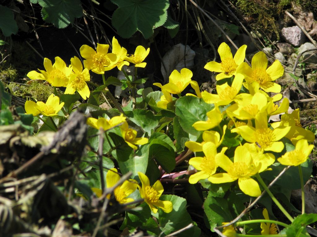 - Die Sumpfdotterblume (Caltha palustris), als eine der wenigen Vertreter der Frühjahrsblüher am Teich. Sie wächst an sonnigen bis halbschattigen Plätzen und ist wegen der schönen goldgelben Blüten sehr beliebt. Die Blüten der Wildart bieten vielen Insekten erste Nahrung im Jahr. Es gibt einige Zuchtformen der Sumpfdotterblume, wobei die Sorten mit gefüllten Blüten für Insekten wertlos sind. Caltha palustris wächst horstig und wirkt in einer kleinen Gruppe besonders schön. Im Grunde ein Muss für jeden Gartenteich.